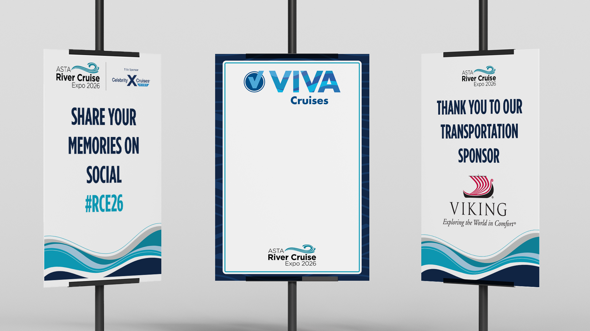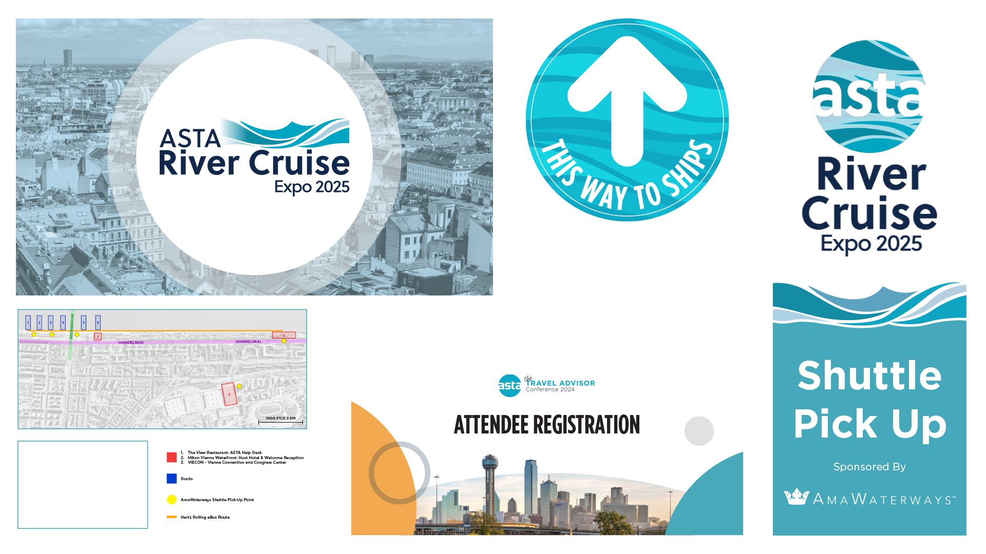 Designed and implemented a comprehensive wayfinding and event communications system for large-format environments at ASTA’s River Cruise Expos and Travel Advisor Conference. The work focused on ensuring clear navigation, accurate information delivery, and consistent visual presentation across multiple high-traffic event assets while maintaining strict partner co-branding requirements.